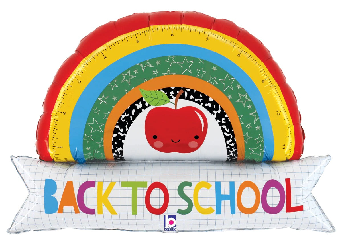 Add color and cheer to the classroom with this Back to School Rainbow Banner balloon by Betallic! This 35-inch foil balloon features a vibrant rainbow arching over a notebook-style “Back to School” banner and a cute apple, perfect for welcoming students and celebrating the new school year.