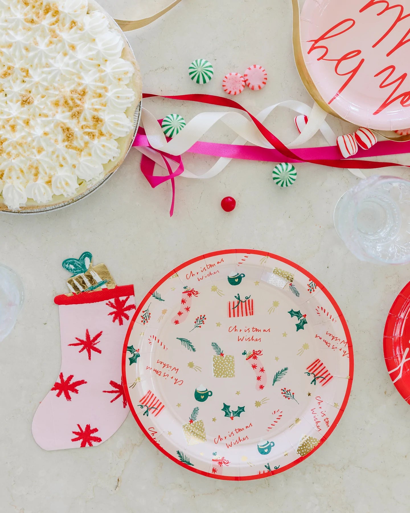 These festive party plates feature favorite Christmas icons including stockings, presents, cocoa and holly and will make a merry statement at your Holiday table! Measuring nine inches these paper plates create a jolly atmosphere at Christmas breakfast or are the perfect way to spread some Holiday cheer with a plateful of Christmas goodies.