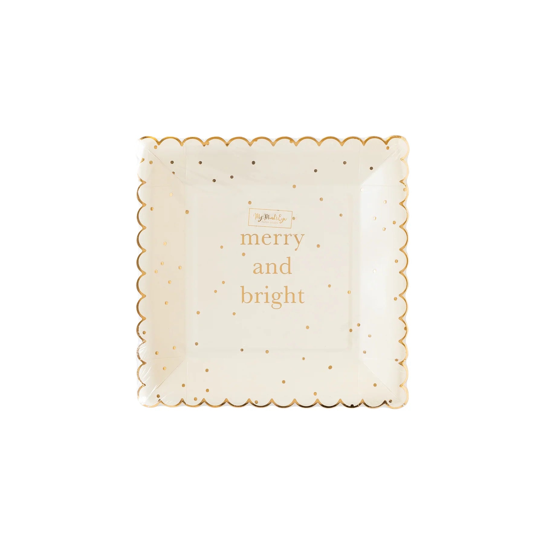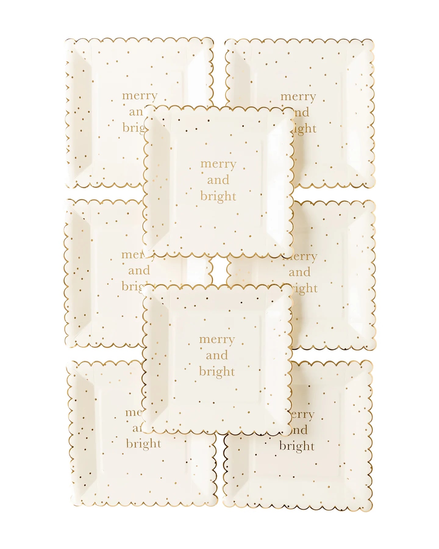When you are planning a merry and bright Christmas party, make sure to include this 8 inch scalloped paper plates. Featuring gorgeous gold foil details including the merry message "Merry and Bright" and festive confetti dots. These party plates are the perfect addition to a Holiday place setting at Christmas dinner!