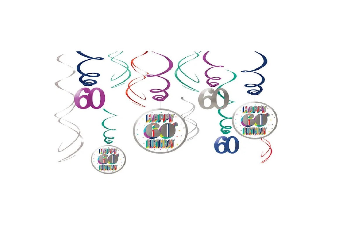 Make their 60th birthday really shine! Double-sided 60 and Happy 60th Birthday cutouts dangle from blue green and purple swirls next to swirls in metallic silver and red finishes. Easily hang these Here's to 60 Birthday Swirl Decorations by the attached plastic hooks to add a fun texture to the venue! Here's to 60 Birthday Swirl Decorations include: 6 swirl decorations 3 swirl decorations with 7in cutouts 3 swirl decorations with 5in cutouts Attached plastic hooks.