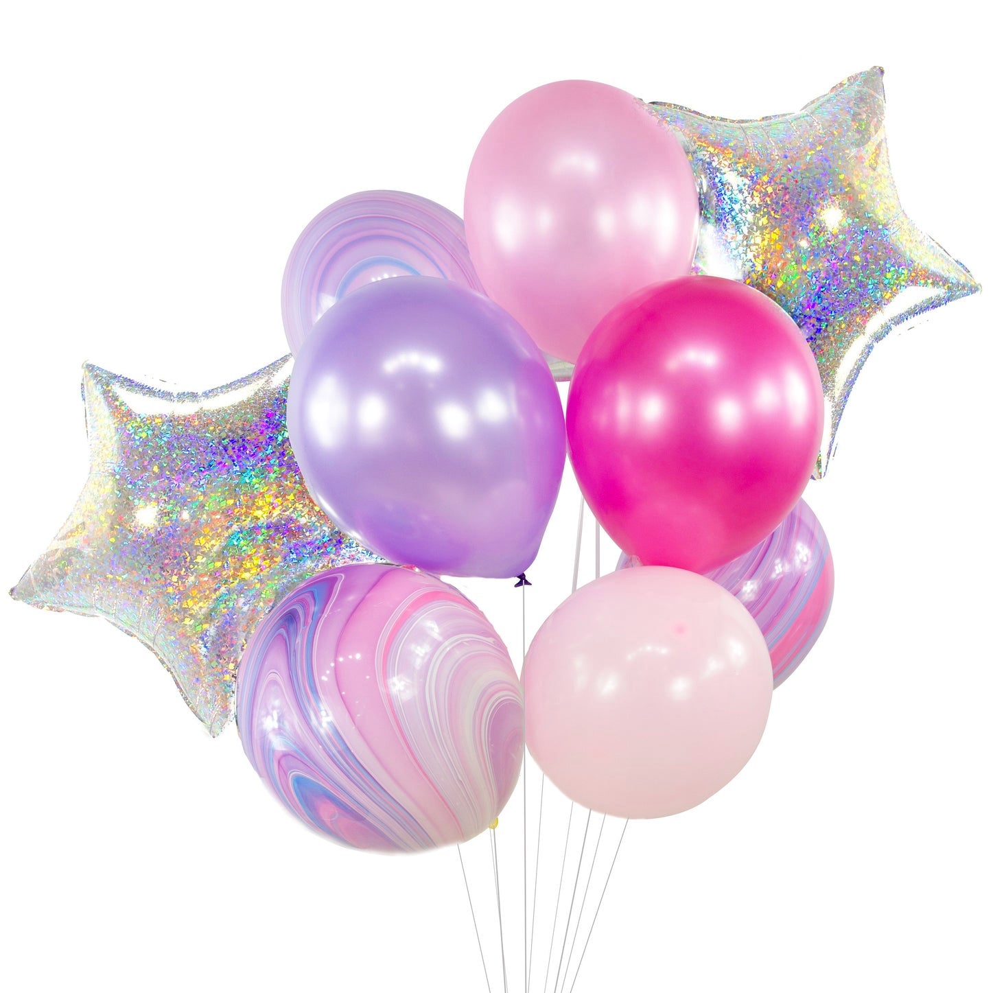 This gorgeous mix of balloons in different finishes is so sparkly and fun! A confetti pattern is printed onto the clear balloons for a stress-free "stuck to the sides" look.