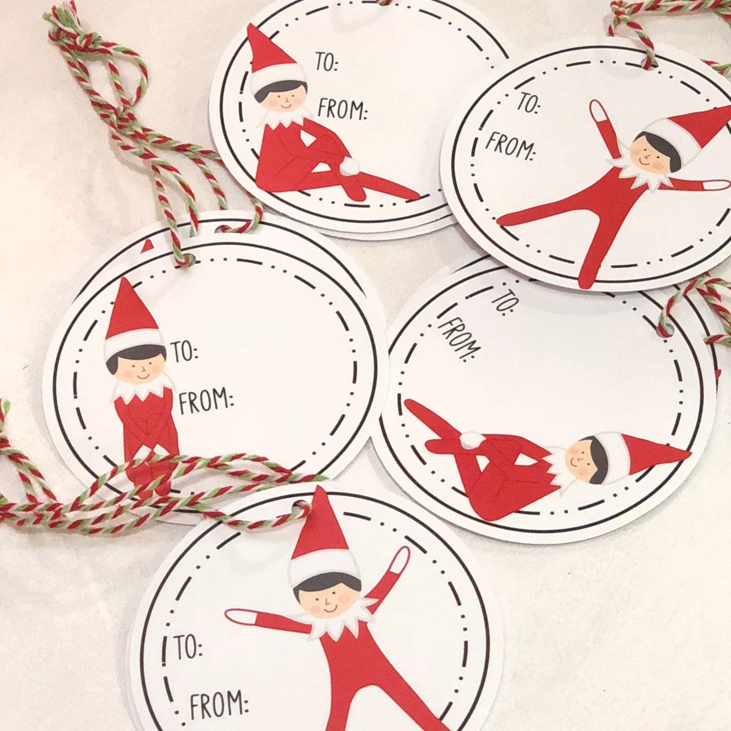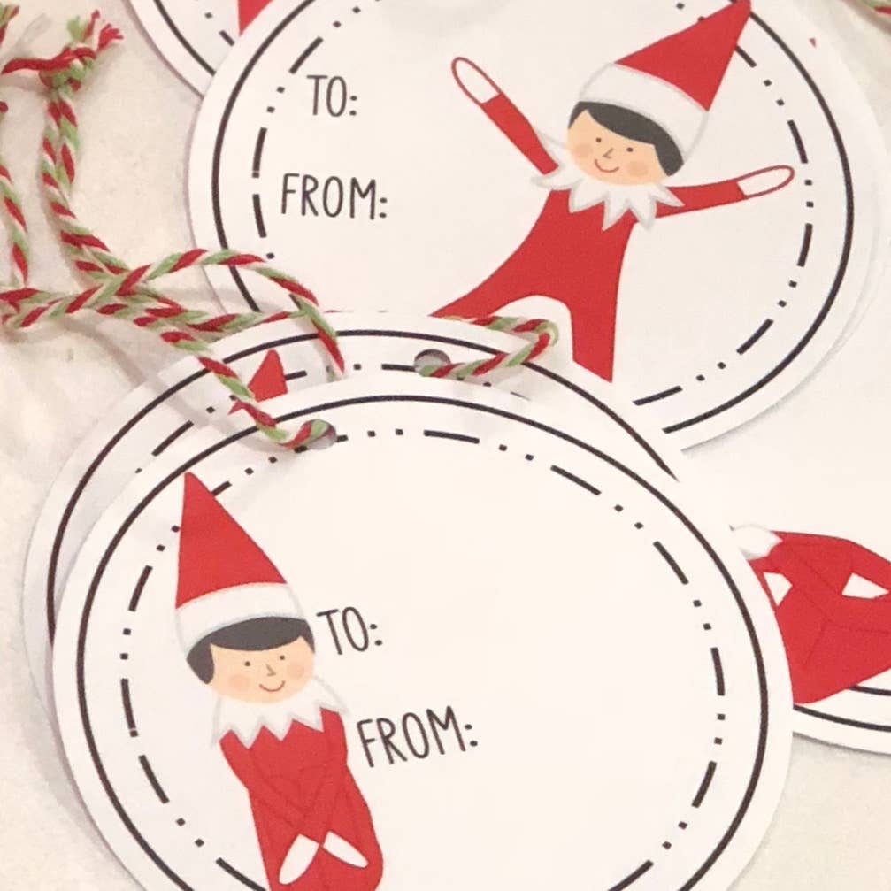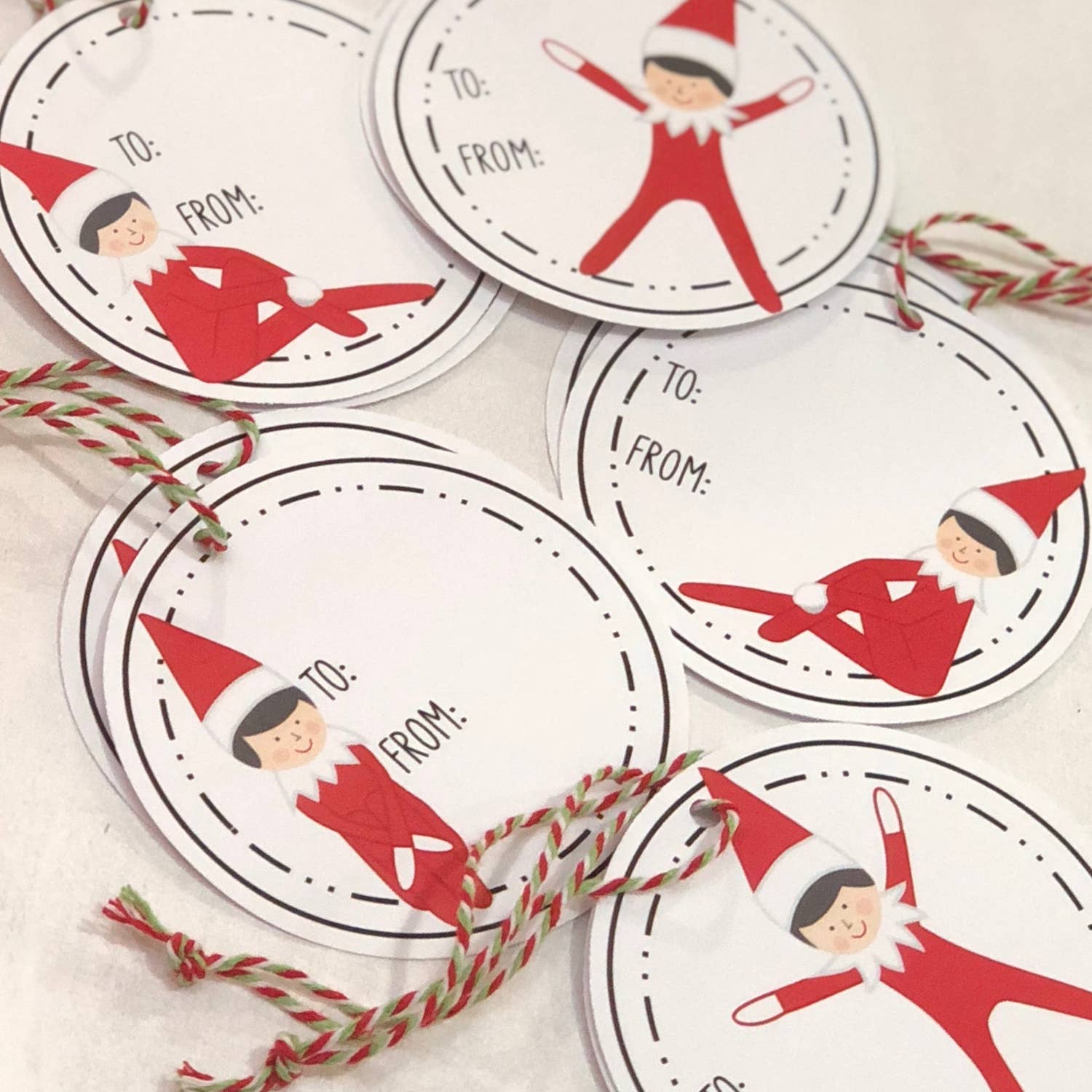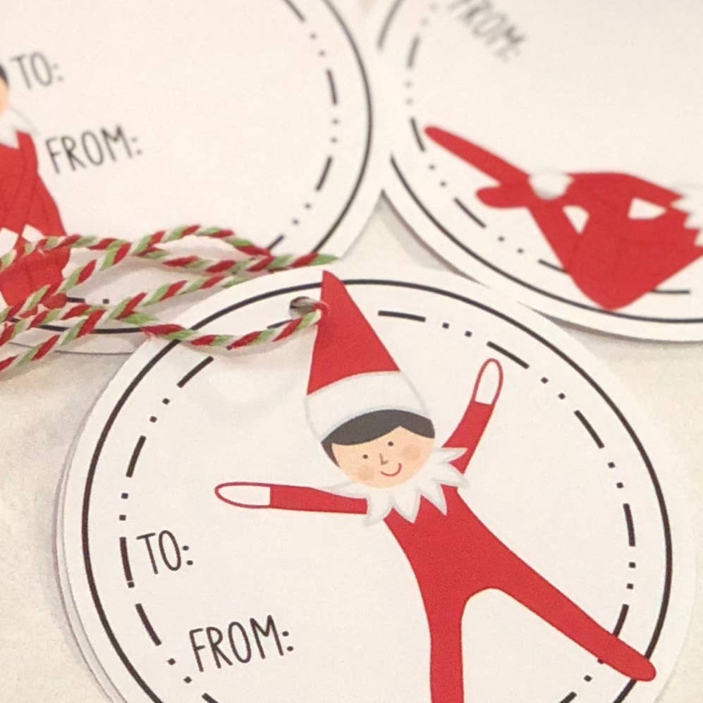 The Elf has jumped off the shelf and onto these festive gift tags. The 110 lb. cardstock tags measure 3" in diameter and have the words "To" & "From" printed upon them. A set of ten tags are included and feature red & green Bakers' twine to tie right on your gifts.