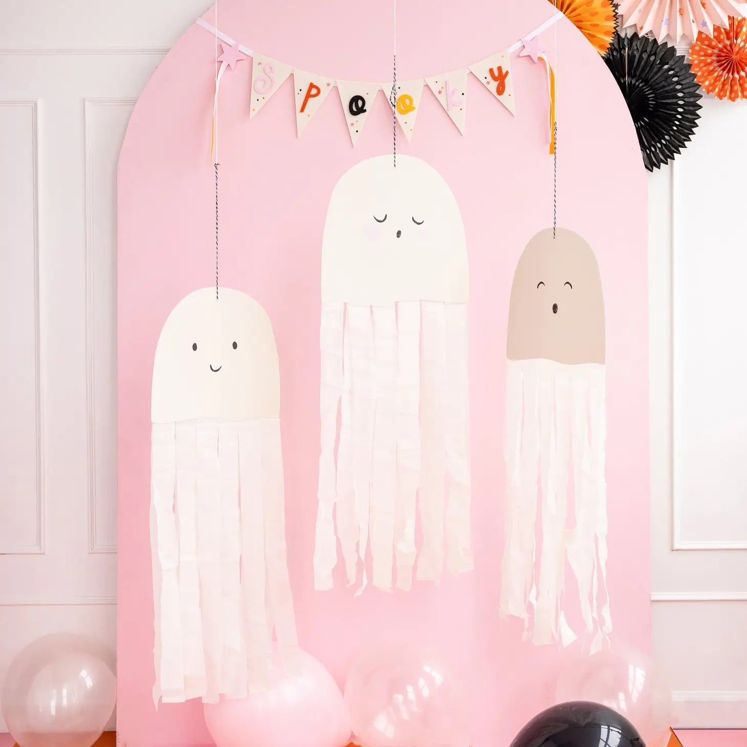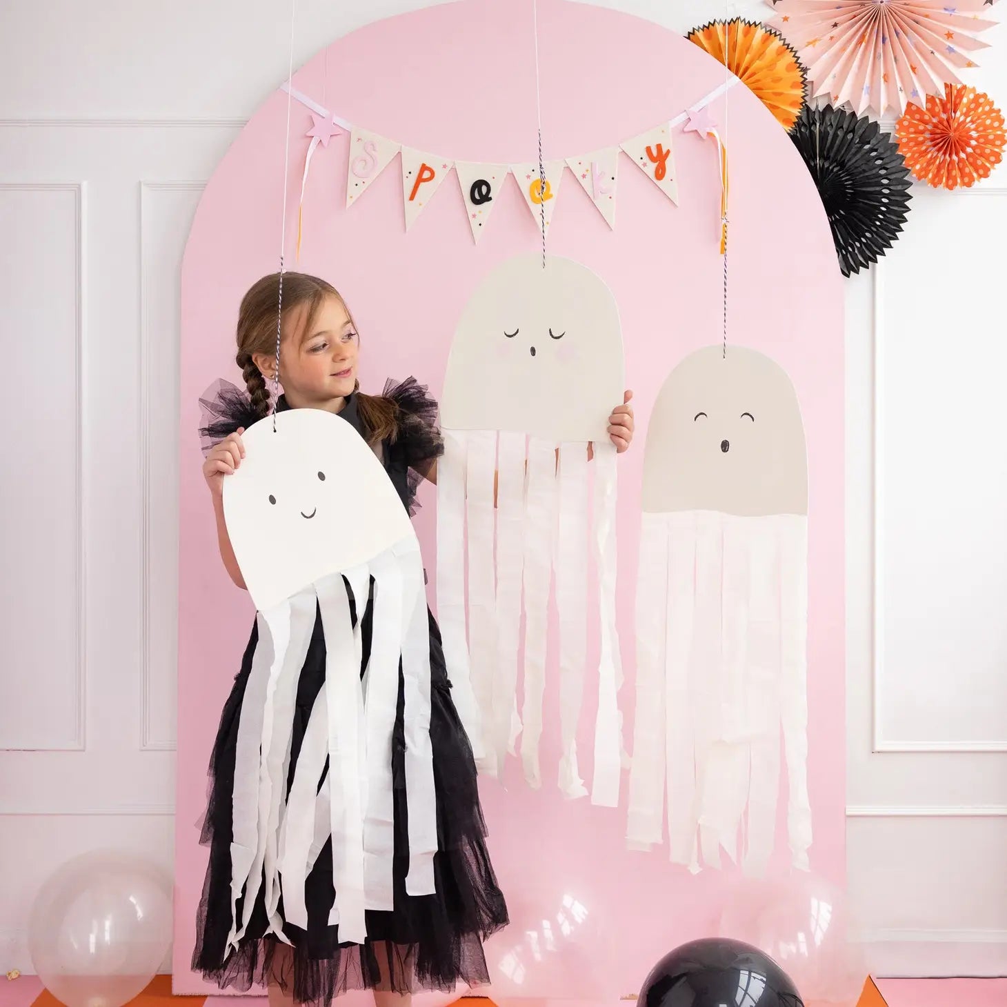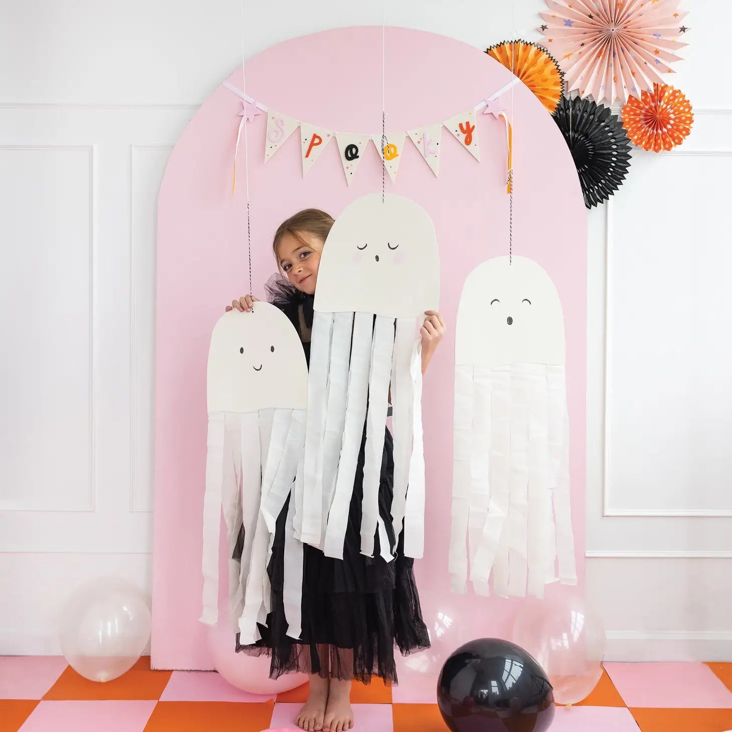 Hang with the ghouls this Halloween with this set of hanging ghosts. Included are 3 ghost that feature crepe streamers for an extra frightful detail and are sure to add just the right amount of fright your Halloween party.