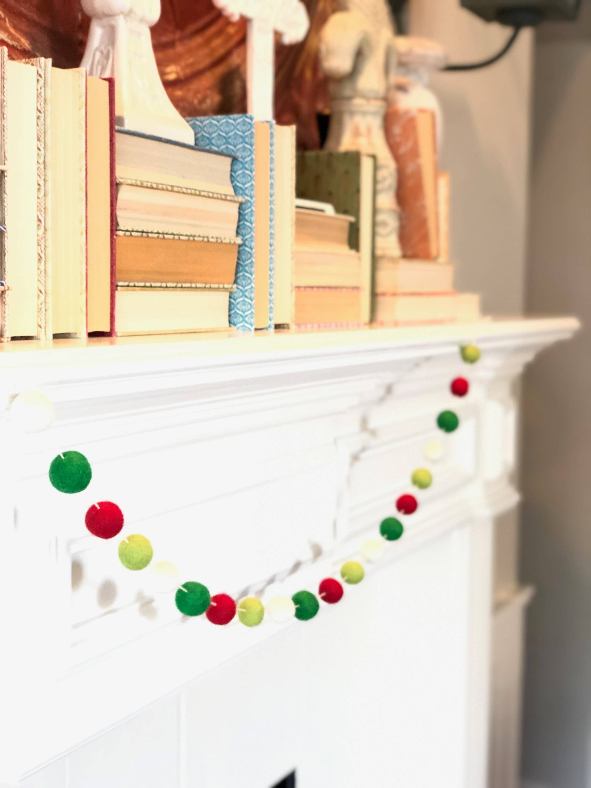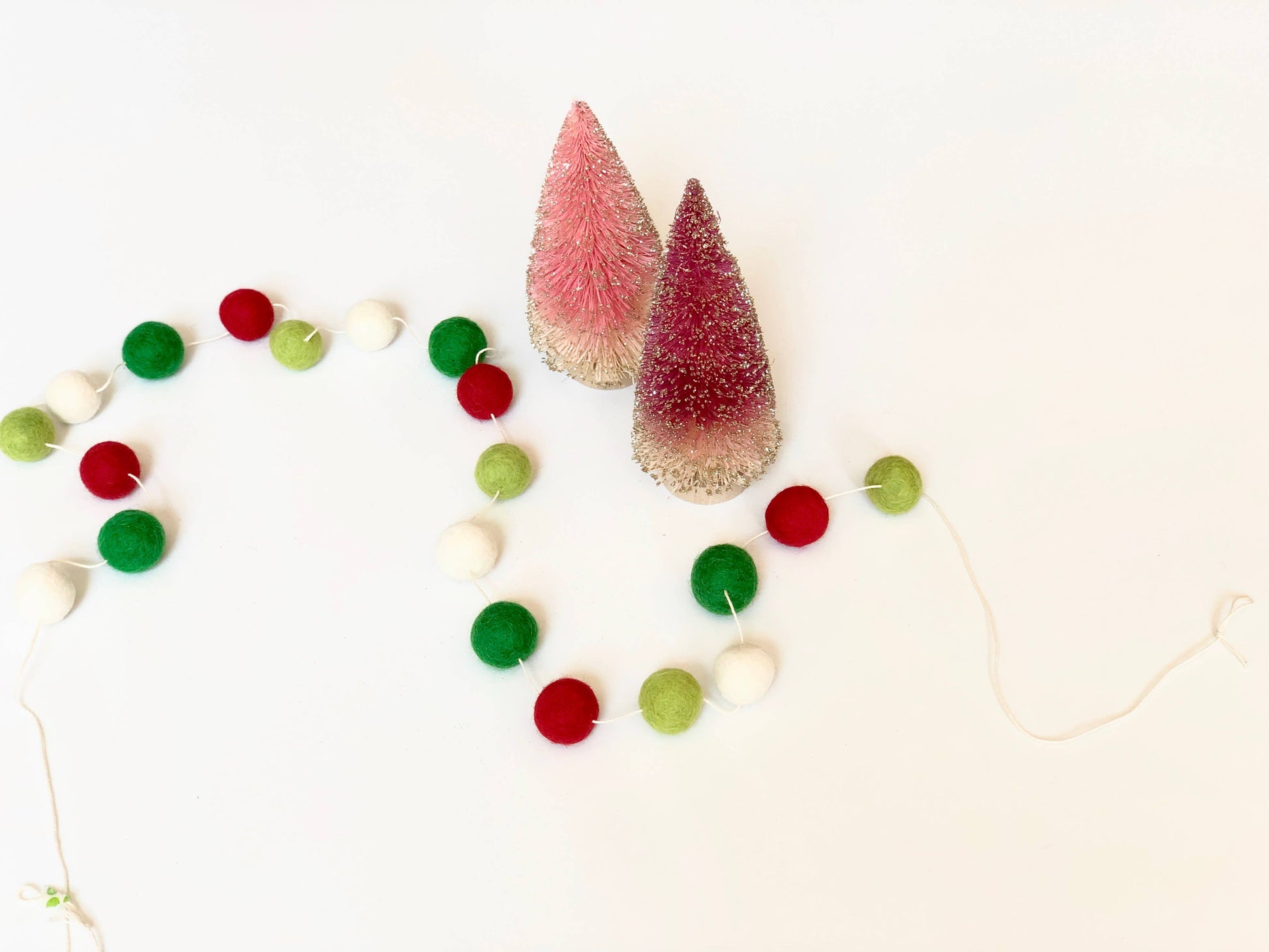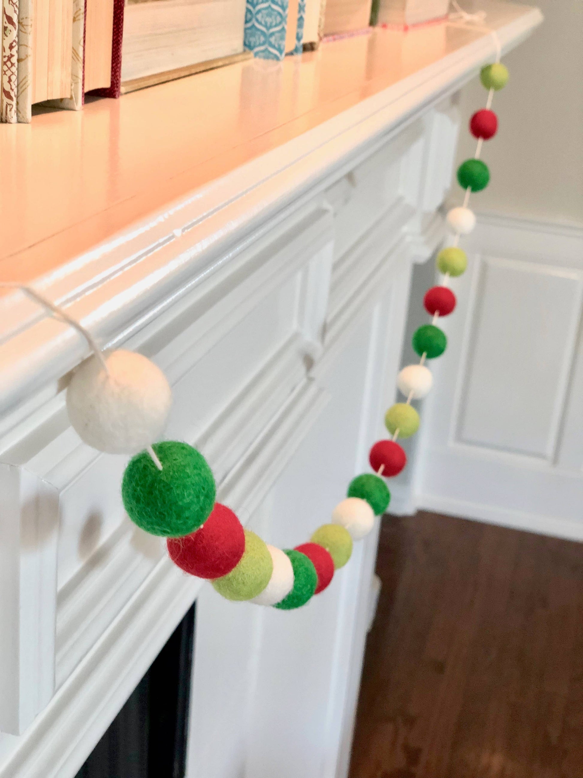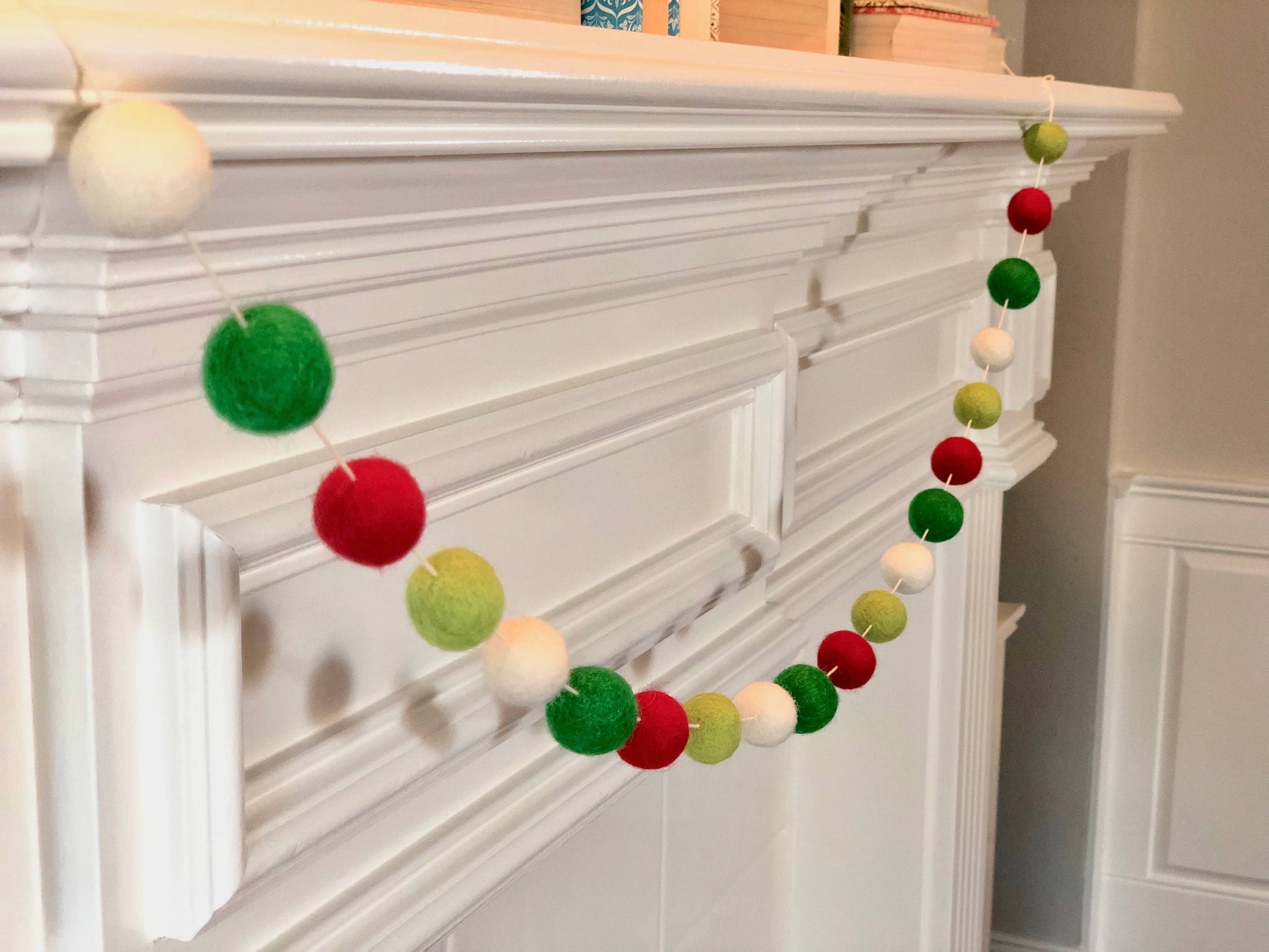 Decorate for the season with this joyful & happy wool felt ball garland. Wool felt balls in crimson red, chartreuse green, ivory snow, & Kelly green adorn this 5 feet long cotton twine. The 2 cm felt ball sizes and colors may vary slightly, as they are all handmade. The felt balls are strung on cotton twine and are movable, so that you may space the felt balls as you please. The garland includes 20 felt balls in the four festive colors. The end of the garland is knotted with a loop for hanging.