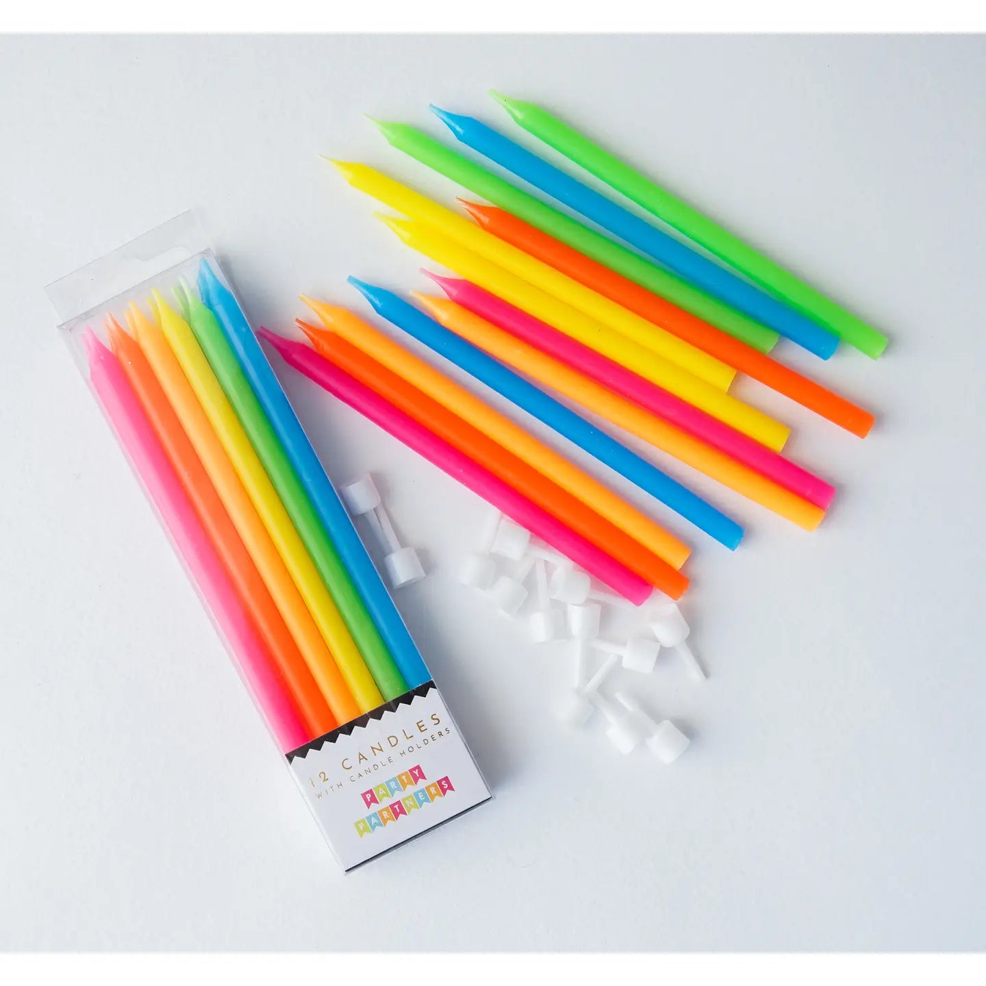 Neon Rainbow Gradient 12 Candle Set with candle holders for perfect placement. Size: 3.5” tall