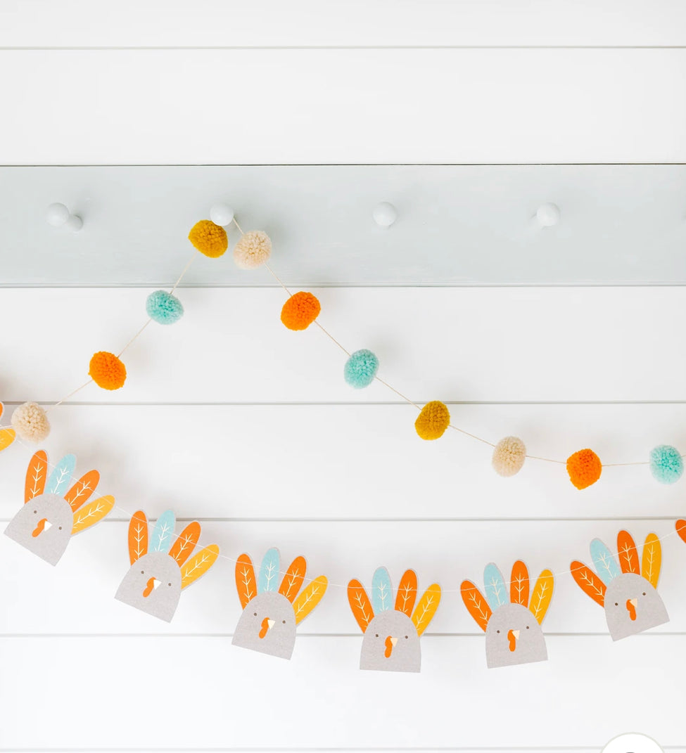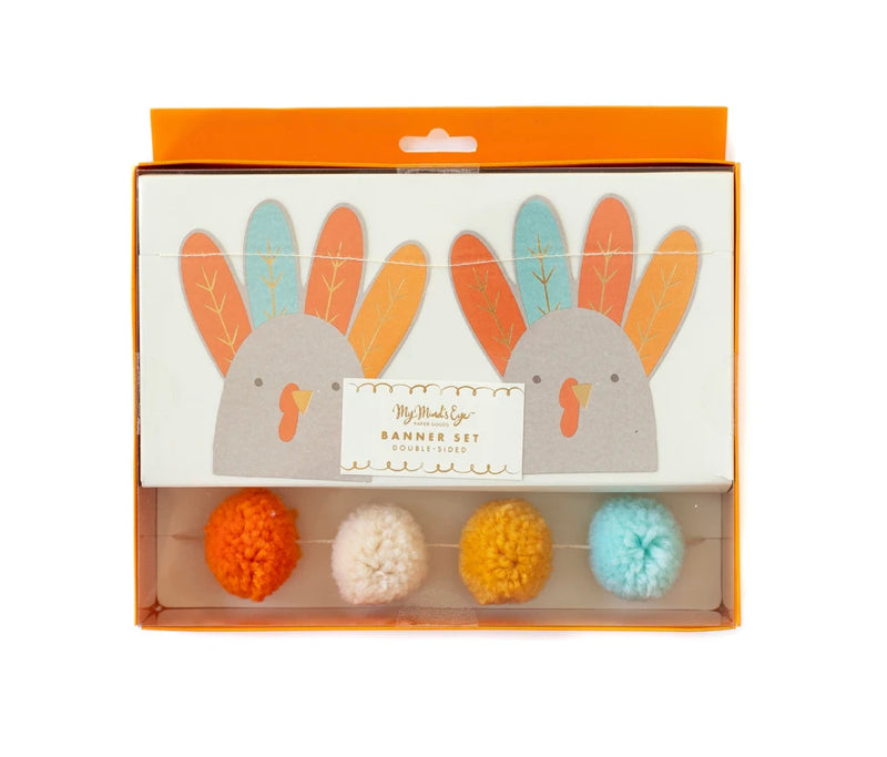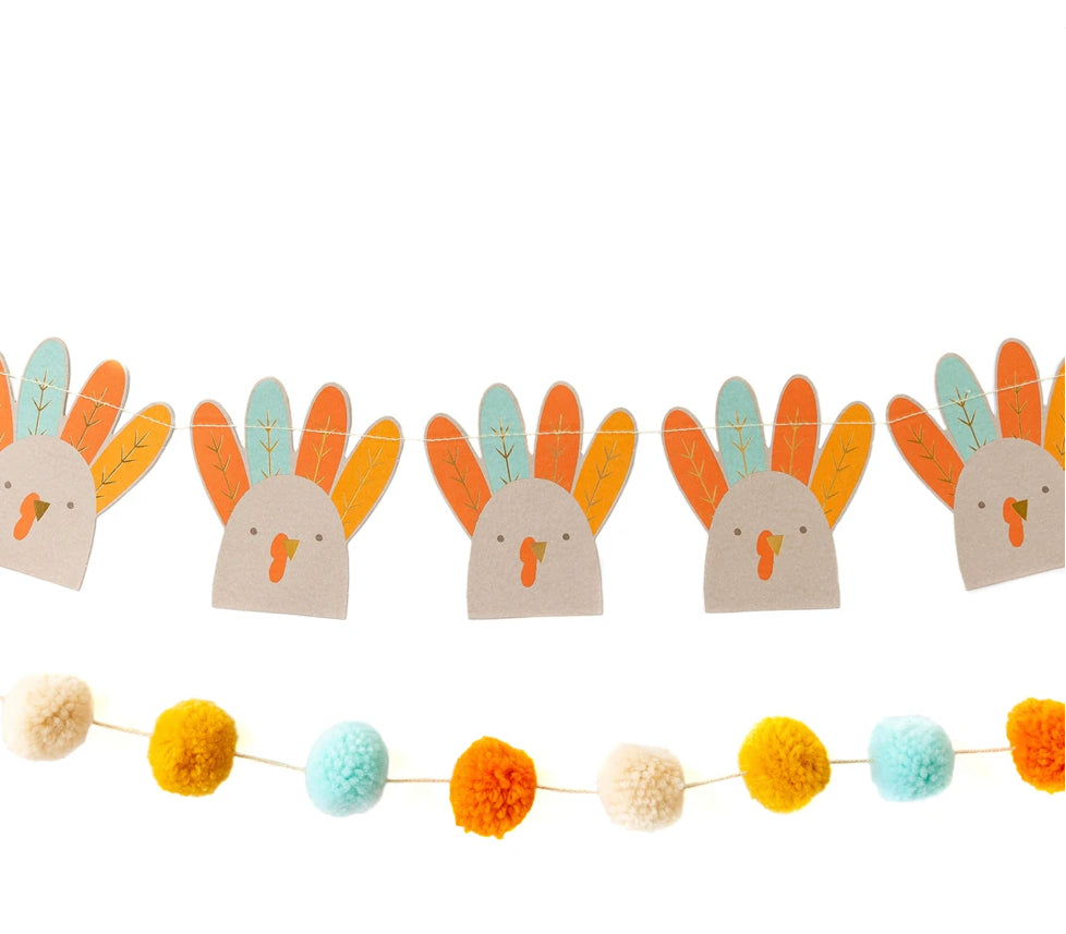 Invite Tom Turkey to your Thanksgiving celebrations this year with this sweet turkey and pom pom banner set. The bright colors of this banner set will liven up the kids corner at Thanksgiving dinner! This banner set includes yarn poms poms and brightly colored turkeys with gold foil accents.